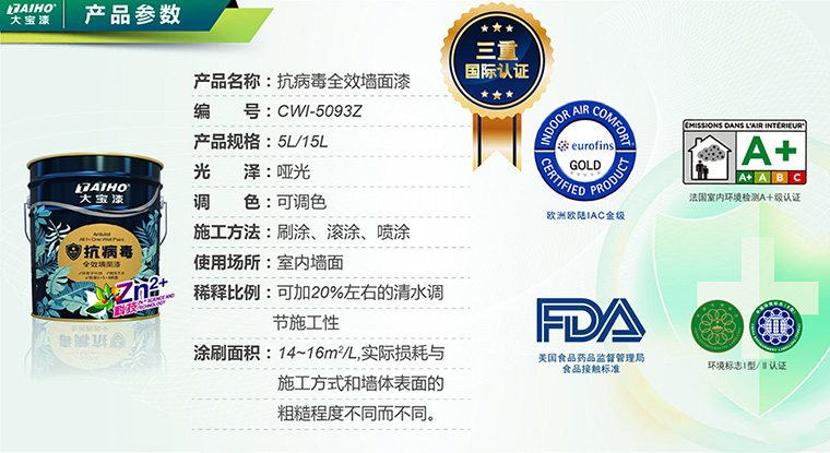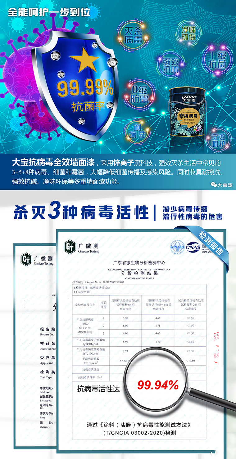 大寶抗病毒全效墻面漆,采用鋅離子黑科技,強(qiáng)效滅殺生活中常見的3+5+8種病毒、細(xì)菌和霉菌,大幅降低細(xì)菌傳播及感染風(fēng)險(xiǎn)。同時(shí)兼具耐擦洗、強(qiáng)效抗堿、凈味環(huán)保等多重墻面漆功能,大寶超強(qiáng)“鋅”生力,用專業(yè)和愛為家人筑起健康防護(hù)墻。