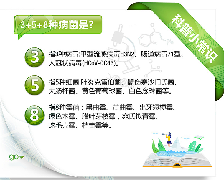 ◆3,指3種病毒:甲型流感病毒H3N2、腸道病毒71型、人冠狀病毒(HCoV-OC43)。◆5,指5種細(xì)菌:肺炎克雷伯菌、鼠傷寒沙門氏菌、大腸桿菌、黃色葡萄球菌、白色念珠菌等。