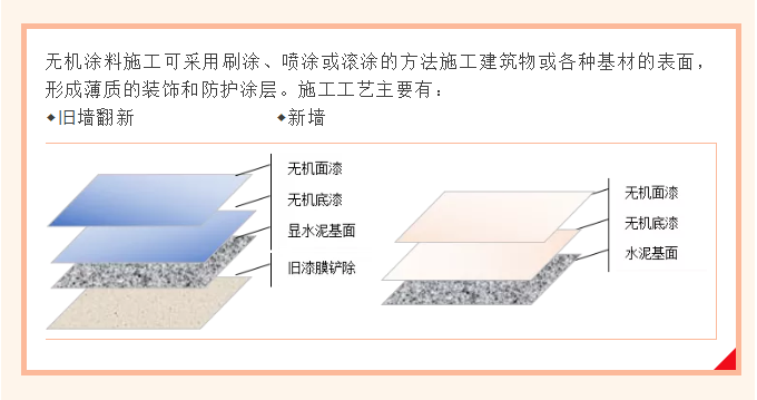 新墻面建議直接在水泥基面上施工無機涂料,因無機物質與水泥基面形成穩定的結構,使用防護功能及效果更佳。