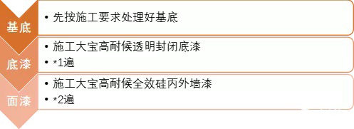 大寶高耐候全效硅丙外墻體系,采用高性能有機硅改性丙烯酸乳液,搭配凈味技術配方,產品在兼具環保性能優勢的同時重視戶外耐候性、透氣防水、附著力、防潮抗堿、耐黃變、抗污等卓越功能。推薦用于各類高檔外墻面、高架橋涂飾等涂裝需求。