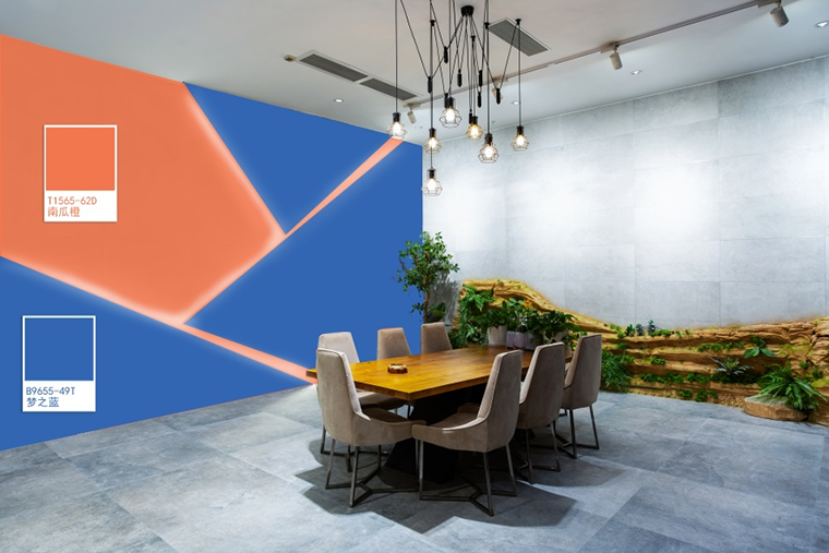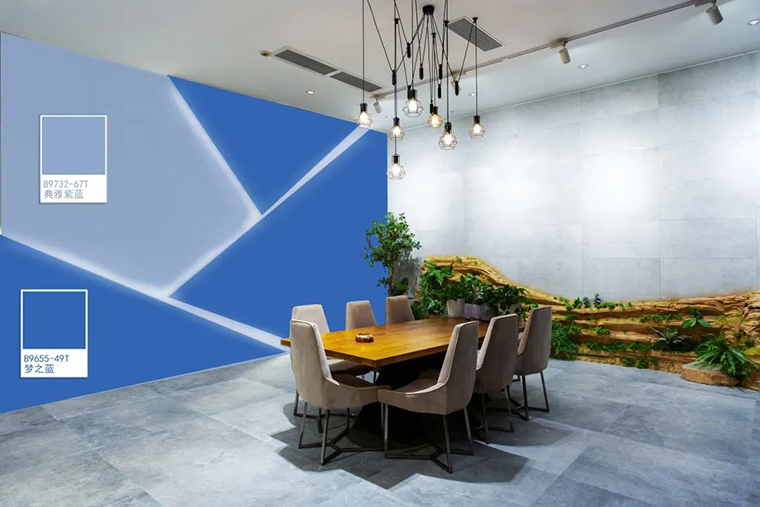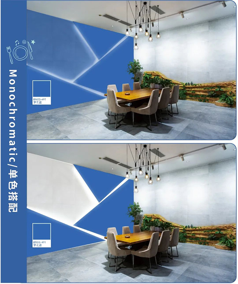因為藍色讓人明顯降低食欲。Pantone色彩研究所Leatrice Eiseman說過:藍色可以很好地表現(xiàn)出恒定和信任感,也能呈現(xiàn)出時髦的現(xiàn)代風格。所以今天大寶色彩研發(fā)團隊將通過夢之藍B9655-49D色系搭配,在餐廳中使用藍色,擺脫「藍色魔咒」!