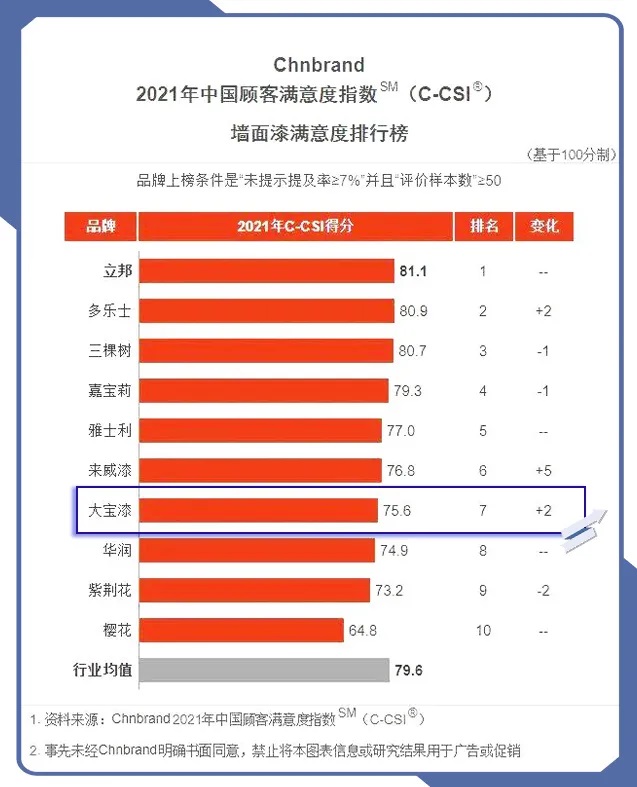 7月20日,品牌評級權威機構Chnbrand發(fā)布2021年度(第七屆)中國顧客滿意度指數(shù)(C-CSI)品牌排名及分析報告。大寶墻面漆與木器漆分別以第七、第九的優(yōu)異排名入圍榜單,其中墻面漆較去年排名上升了2位,木器漆較去年上升了1位。