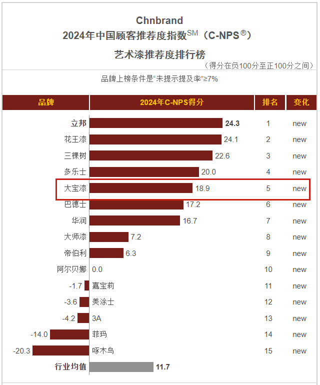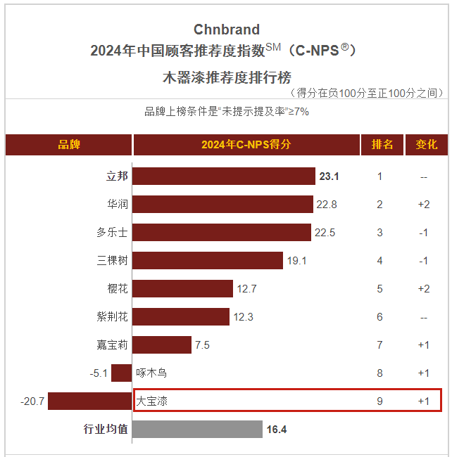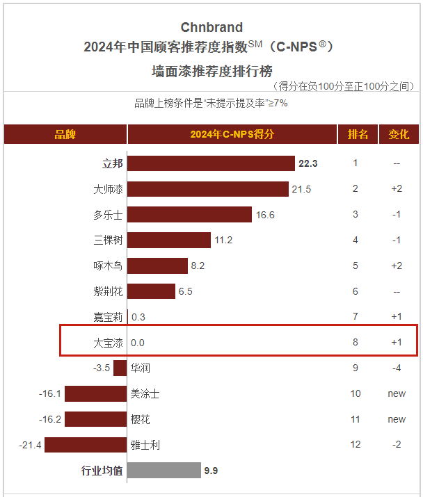 1月,品牌評級權威機構Chnbrand發(fā)布2024年(第十屆)中國顧客推薦度指數(shù)(C-NPS)品牌排名和分析報告。大寶墻面漆、木器漆、藝術漆分別以優(yōu)異的口碑入圍排行榜單。