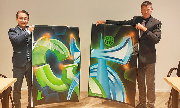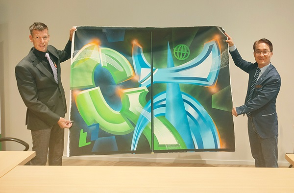 此次簽約儀式別具創(chuàng)意與情感意義,高樂伯總裁Kees特別邀請當?shù)刂嫾乙浴癎”與“T”兩個字母為主題,分別代表Global Paint與Taiho Paint,創(chuàng)作一幅融合東西方藝術(shù)語匯的油畫作品。簽約當日,雙方代表共同剪下畫作中央,各自保留一半,象征兩家企業(yè)跨越地域、文化的深度連結(jié)。
