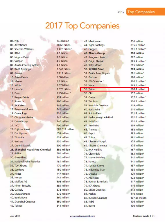 日前,美國(guó)Coatings World雜志(July 2017)最新發(fā)布2017年全球頂級(jí)涂料制造企業(yè)銷售額排行榜(前84名)(2017 Top Companies),中國(guó)5家涂料企業(yè)殺入重圍。大寶漆再次進(jìn)入該榜單,位列第55名,較上年排名前進(jìn)了三位。