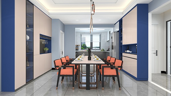 深藍(lán)或?qū)毸{(lán)與藕粉色對(duì)比搭配,展現(xiàn)出視覺沖擊力。藕粉色的溫暖柔和能有效中和藍(lán)色的冷調(diào),瞬間讓家居配色與眾不同,凸顯獨(dú)特的個(gè)性化風(fēng)格,為空間注入現(xiàn)代感與藝術(shù)氛圍,讓人眼前一亮。
