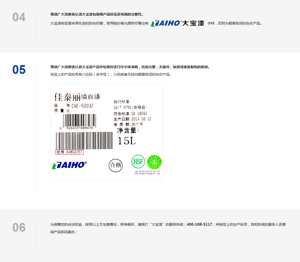 為有效防止假冒侵權(quán)產(chǎn)品,維護(hù)消費(fèi)者權(quán)益,大寶漆所有產(chǎn)品都有產(chǎn)品標(biāo)識碼,供所有消費(fèi)者能明確方便地辨別出及購買到真正的大寶漆涂料,并可作為打擊假冒侵權(quán)物品的依據(jù)。以下是大寶漆涂料產(chǎn)品的防偽介紹: